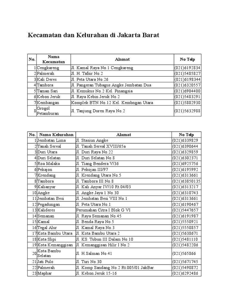 Kecamatan Dan Kelurahan Di Jakarta Barat Pusat Dan Selatan
