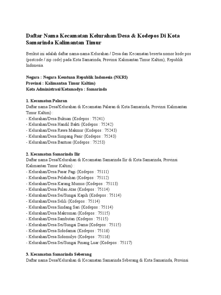 Daftar Nama Kecamatan Kelurahan Dan Kode Pos