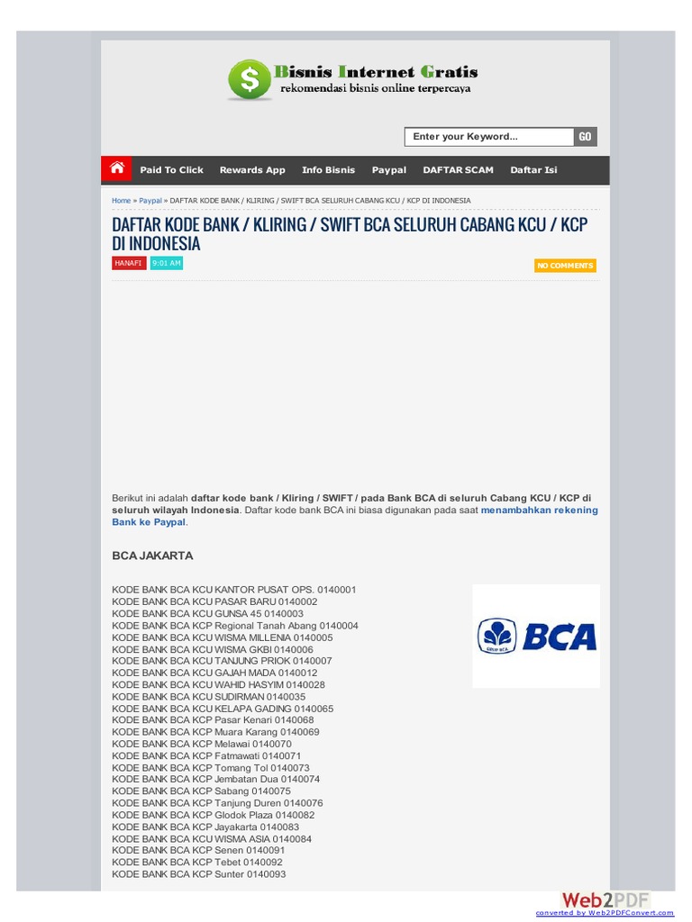 Daftar Kode Bank Kliring Swift Bca Seluruh Cabang Kcu Kcp Di Indonesia